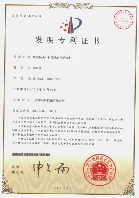 企業(yè)組建了“云浮市石材機(jī)械裝備工程技術(shù)研究開發(fā)中心”,并與高校和科研院所密切合作,致力于光機(jī)電一體化產(chǎn)品的研發(fā)、生產(chǎn)、銷售和服務(wù)。主要產(chǎn)品有框架鋸、全自動連續(xù)磨拋機(jī)、橋式自動切割機(jī)、全自動仿形石線機(jī)、數(shù)控金剛石繩鋸、裁切機(jī)等。產(chǎn)品具有自動化程度高、加工精度高和生產(chǎn)效率高等特點(diǎn)。產(chǎn)品除國內(nèi)銷售外,還出口到歐美、東南亞、韓國、印度、中東、非洲、俄羅斯、澳大利亞等國家和地區(qū),深受用戶好評!皹蚴阶詣忧懈顧C(jī)”被認(rèn)定為廣東省高新技術(shù)產(chǎn)品,擁有發(fā)明專利1項、實用新型專利1項。